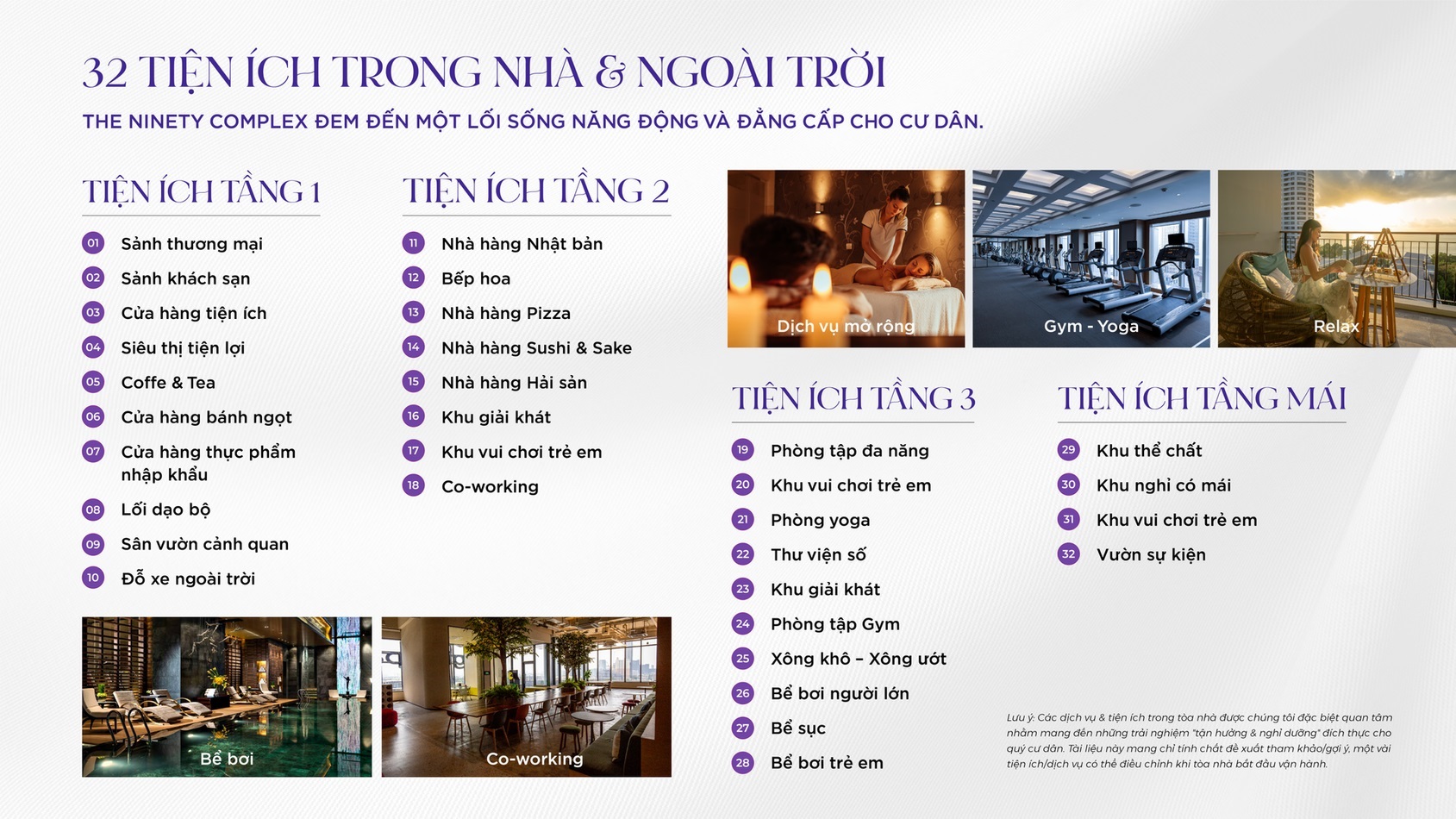 The Ninety Complex được xây dựng với mục tiêu mang lại trải nghiệm sống vượt trội, thông qua hệ thống tiện ích nội khu được thiết kế theo tiêu chuẩn 7S (Smart, Style, Service, Safety, Serenity, Sustainability, Satisfaction). Các tiện ích này không chỉ đáp ứng nhu cầu thiết yếu mà còn nâng tầm chất lượng sống của cư dân.